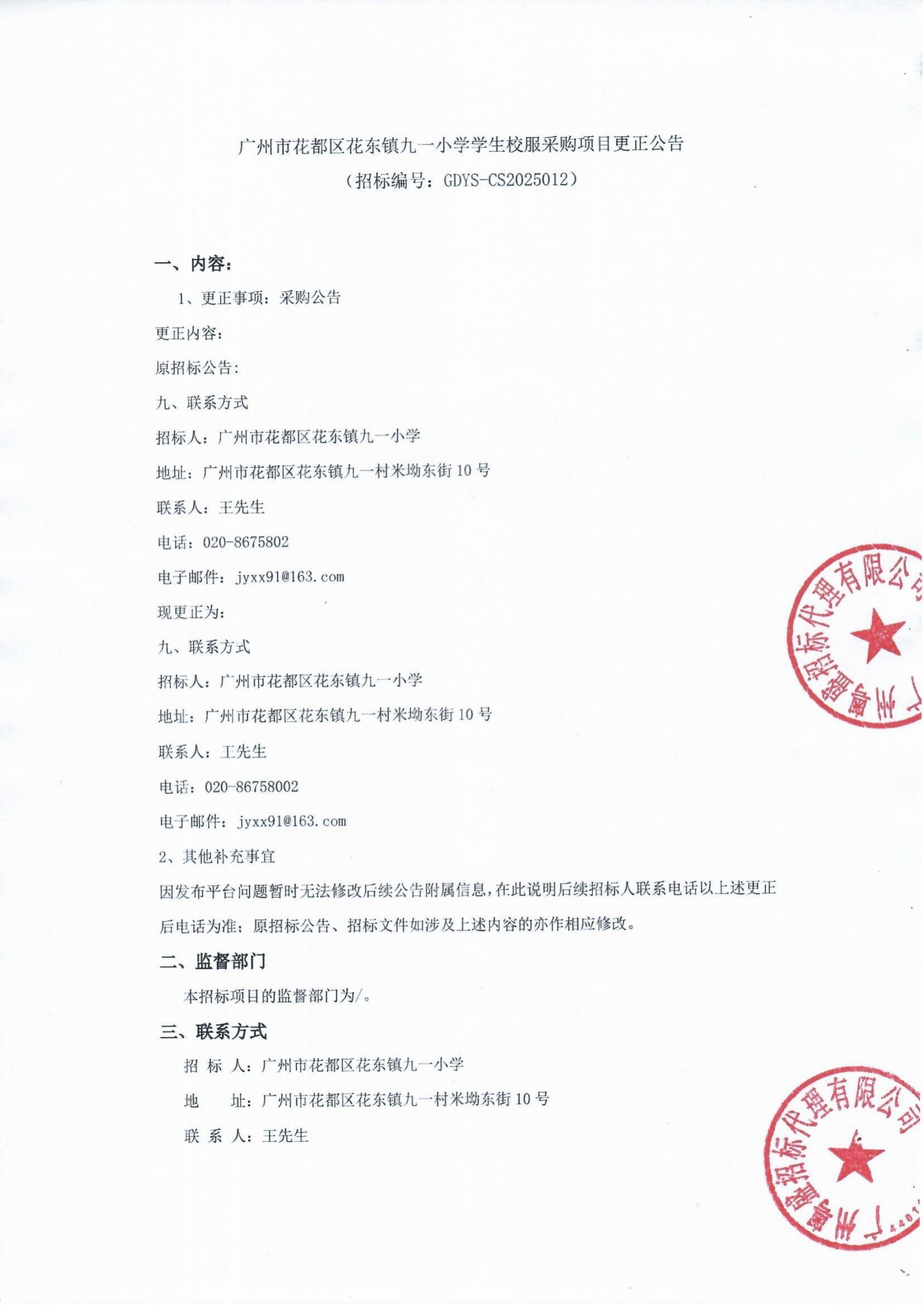 廣州市花都區花東鎮九一小學學生校服采購項目更正公告