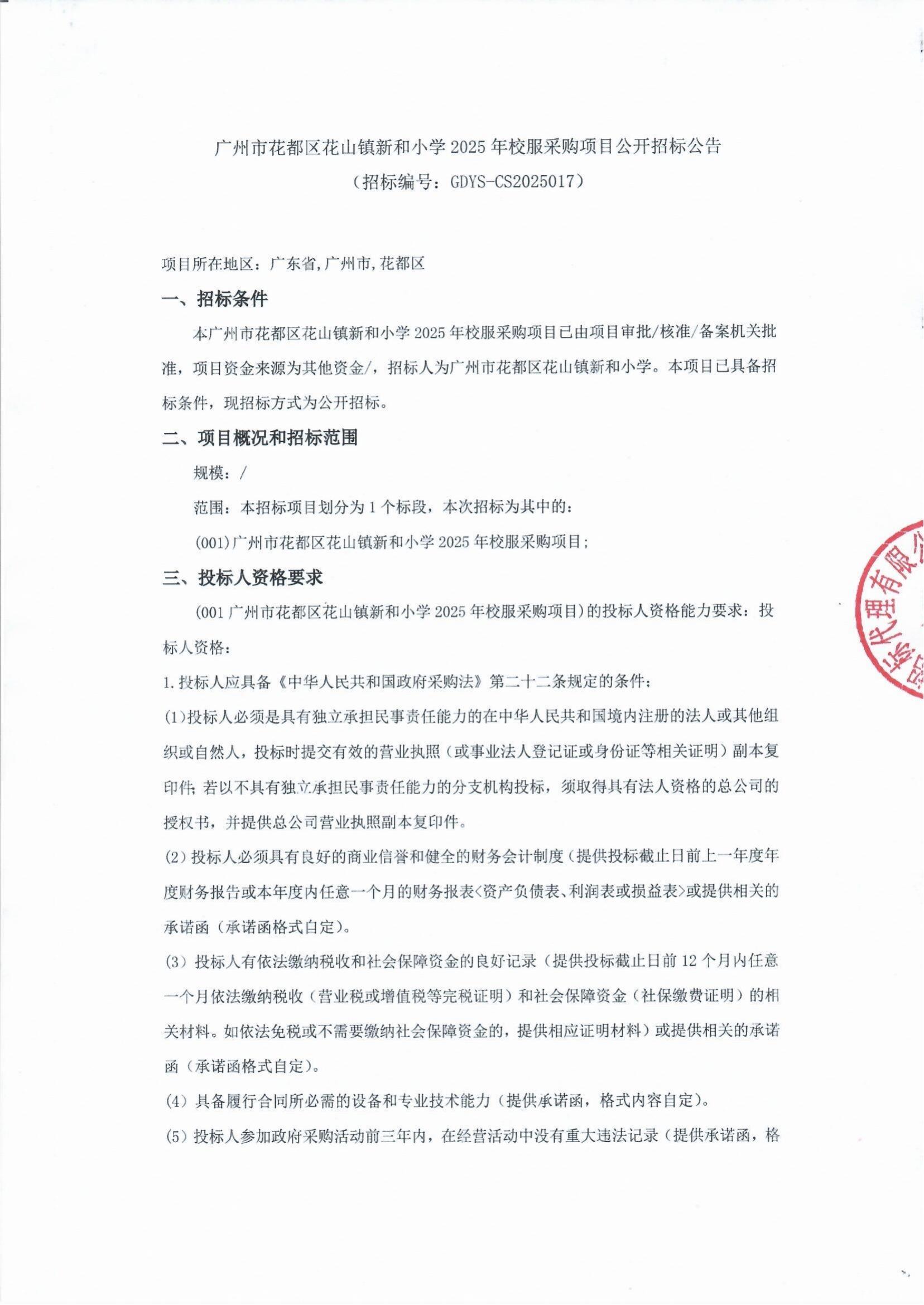 廣州市花都區花山鎮新和小學2025年校服采購項目公開招標公告