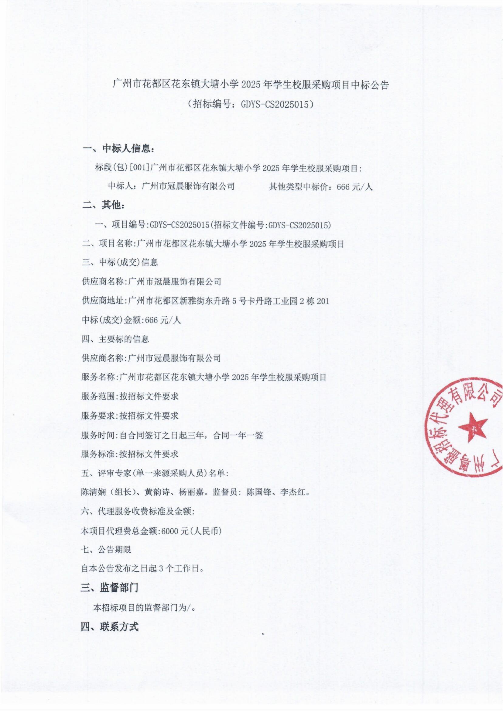 廣州市花都區花東鎮大塘小學2025年學生校服采購項目中標公告